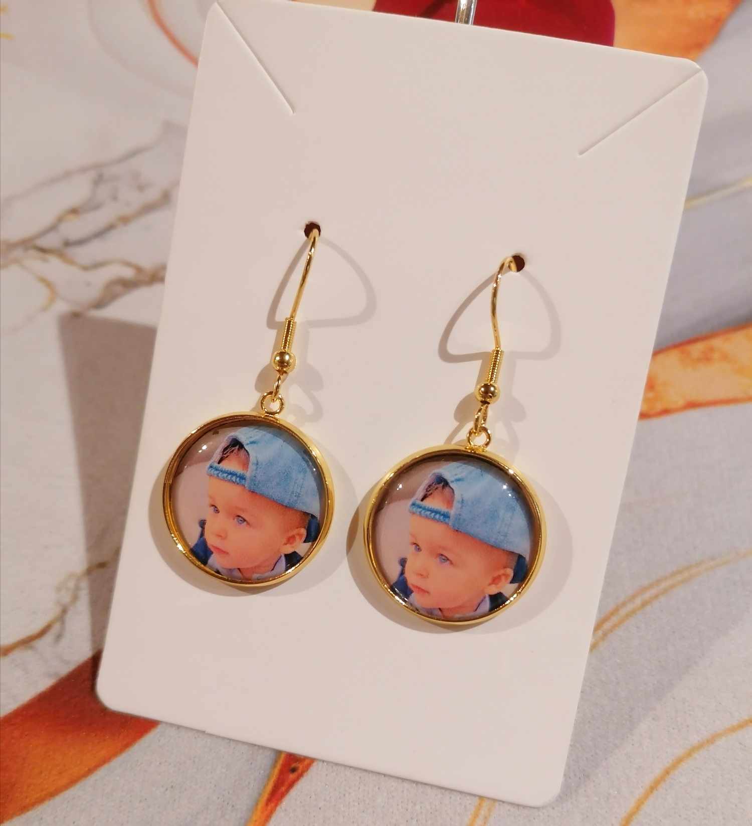 Boucle d'oreille personnalisé avec la photo ou le logo de votre choix, un souvenir inoubliable.