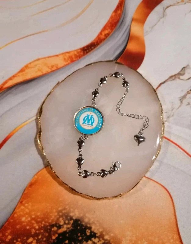 Élégant bracelet cœur Olympique de Marseille en acier inoxydable, longueur 20 cm.