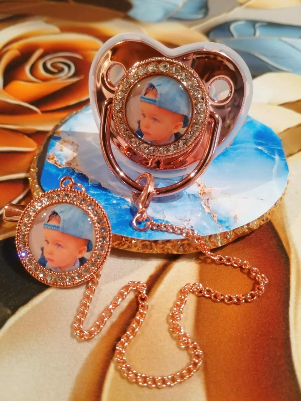 Tétine, sucette avec attache rose gold personnalisé avec la photo / logo de votre choix